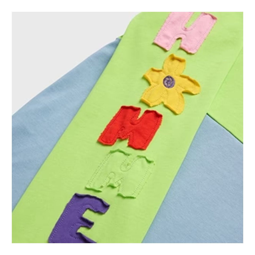 Color blocked in bold lime and powder blue, the Wichita Long Sleeve is a walking vibe. Featuring hand-cut felt letters down the sleeve that spell out HOMME