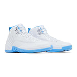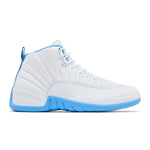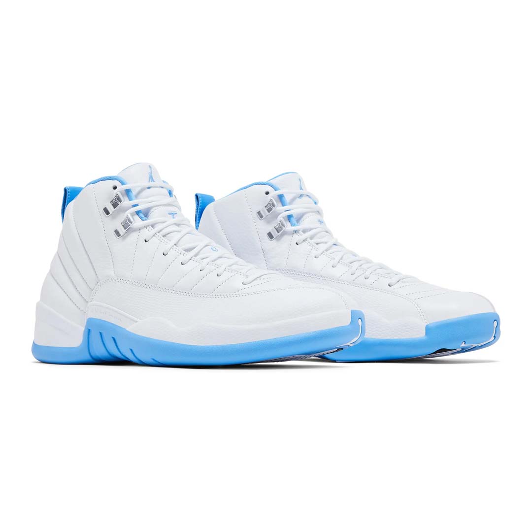 The 2025 edition of the Air Jordan 12 Retro 'Melo' brings back Carmelo Anthony's PE colorway, featuring a two-tone color scheme celebrating the NBA athlete's rookie season with the Denver Nuggets. True to the 2004 original, the retro model employs a white leather upper with radiating stitched lines and a tonal lizard-textured mudguard. University Blue accents make their way to the collar lining, pull tab and rubber outsole, equipped with an exposed carbon fiber shank plate and herringbone traction pods.