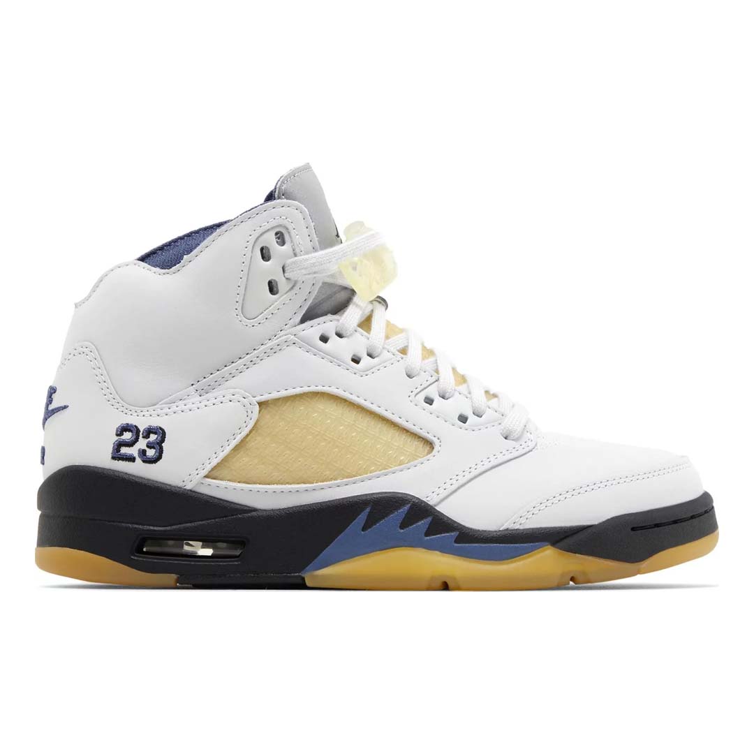 Launching as part of a two-piece collaborative pack, the A Ma Maniere x Women's Air Jordan 5 Retro 'Dawn' sports a pale grey leather upper, revised with a slimmed-down collar and pre-yellowed quarter panel netting formed with A Ma Maniere's 'A' logo. Additional branding elements include an embroidered '23' on the lateral heel, Nike Air branding on the back heel, and mismatched Jumpman and 'A' logos on each silver reflective tongue. Blue shark tooth detailing enlivens a black polyurethane midsole with visible Air-sole cushioning in the heel. A pre-aged translucent rubber outsole features a herringbone traction pattern for optimal grip.